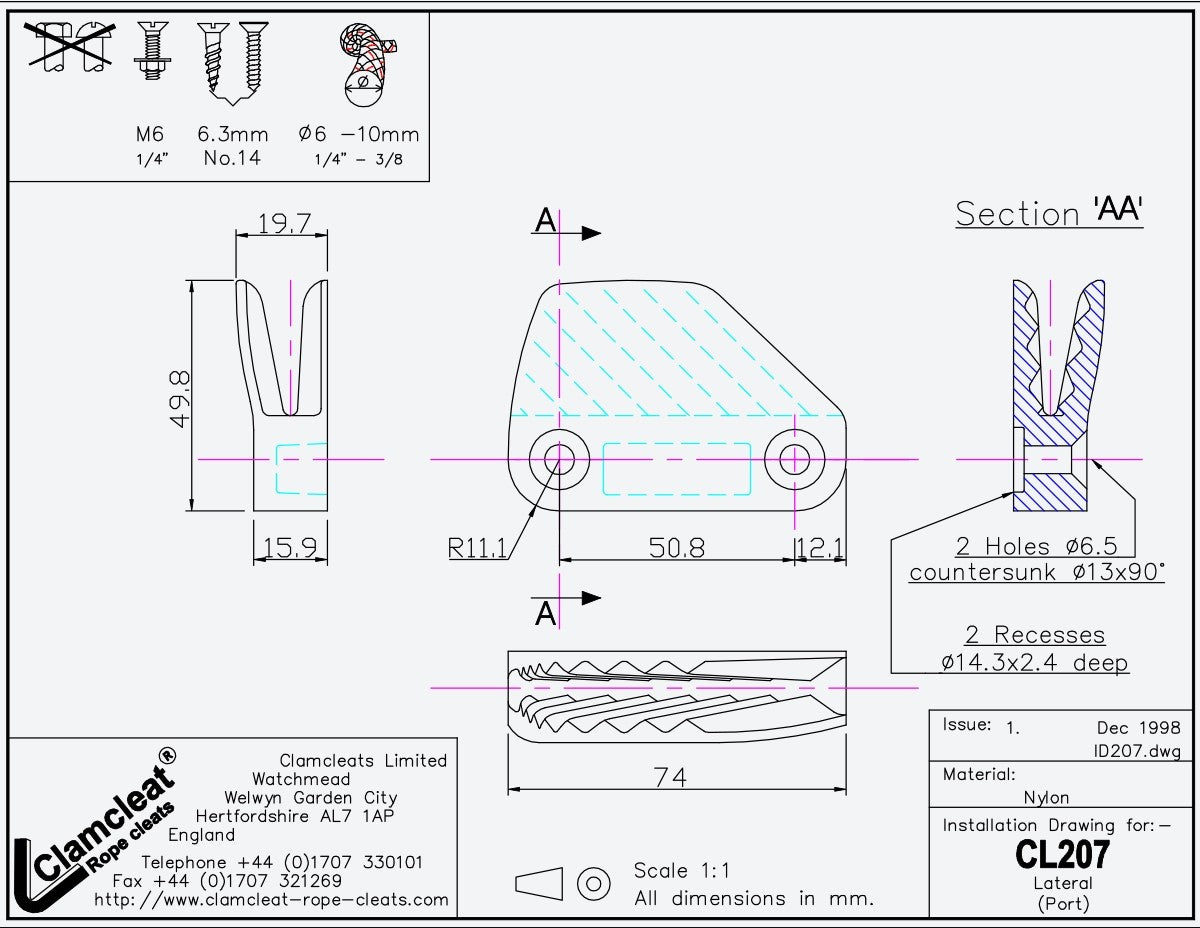 The Clamcleat® CL207 is a cost effective cleat that has a low profile on flat or vertical surfaces. Ideal for control lines on dinghies and sailboats, as well as a variety of non-marine applications. Fix with bolts or screws. The CL207 is also be used also for vehicle roof racks to provide a quick and easy method to secure the ladder to the roof rack during the transit. The starboard version of the CL207 is a CL206 - see below.