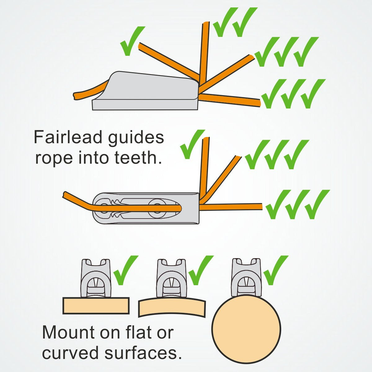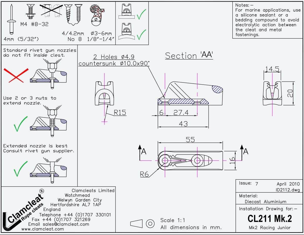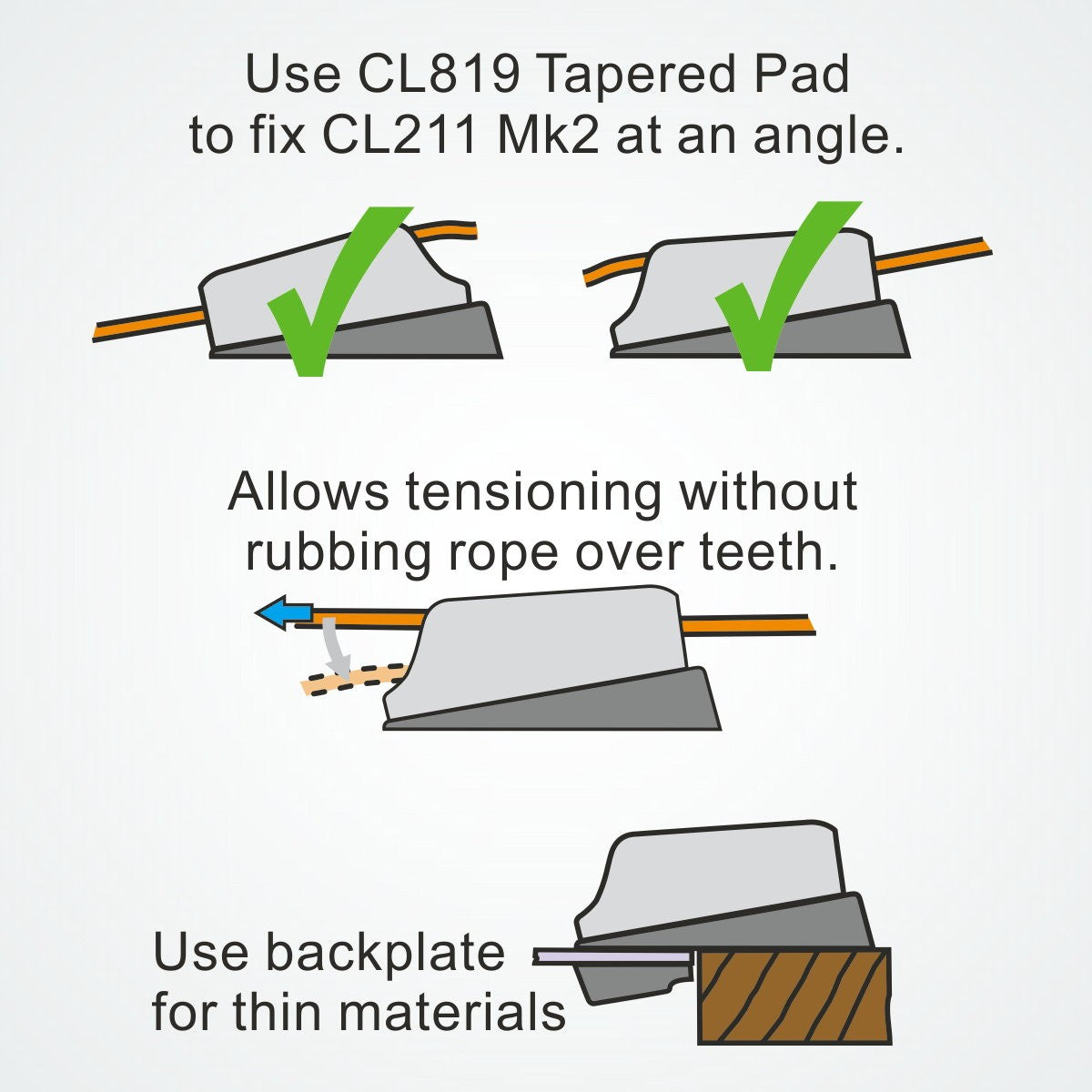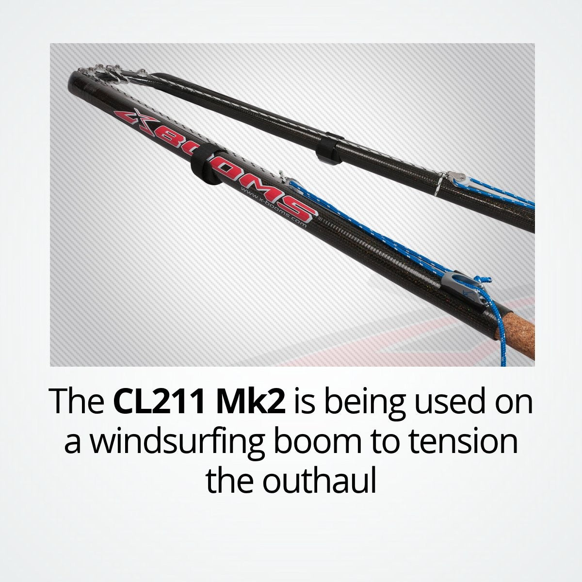 The Clamcleat® CL211 Mk2 is a neat, compact alloy cleat with many uses for sailing, kitesurfing, sports equipment and industrial applications. Manufactured from aluminium for light weight and durable performance. Ideal for halyards & control lines on dinghies & kayaks. Can also be used on sports nets. The fairlead guides the rope into the cleat, which can be fitted to all curved and flat surfaces. Using a CL819 Tapered Pad allows the CL211 Mk2 to be fitted at an angle. This can allow tensioning without rubbing the rope over the teeth. Fitting a CL815 Keeper and CL817 Cage extends the versatility of of his cleat. Use for land fill covers: To stop covers moving, the surface is buried deep and ropes led up through holes in the sheeting. By bolting a CL211 Mk2 cleat and CL815 Keeper to a steel plate, you can hold the ropes securely. It is easy to tension the rope when installing the membrane and also to re-tension as the landfill settles over time. Use for windsurfing: The CL211 Mk2 is being used on a windsurfing boom (X-Booms) to tension the outhaul. The fairlead guides the rope into the cleat, which can be fitted to all curved and flat surfaces. Also, the CL211 Mk2 can be cut down and being used on the tail of a wave boom, see here.