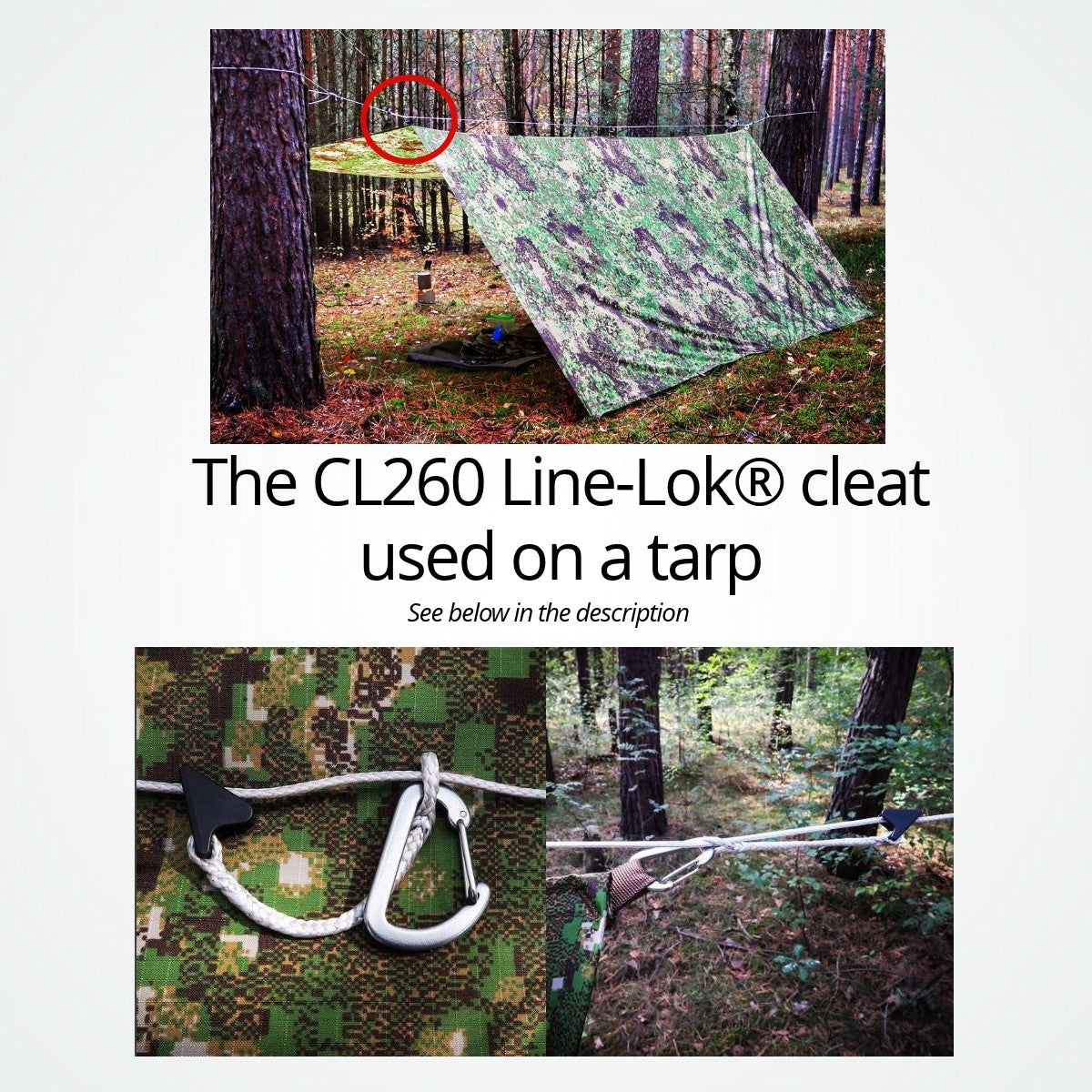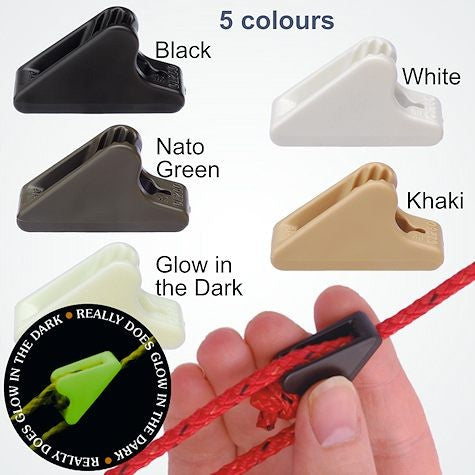 Manufactured from a material that improves its performance the colder it gets, the CL260 Line-Lok® is the ideal choice for holding guylines in winter conditions. The cleat's design locks the rope so it will not slip in windy conditions yet is easy to release. Out-performs traditional alloy and plastic guy runners and guyline tensioners. The Clamcleat® CL260 Line-Lok® guy runner is Ideal for canvas structures, tents, caravan awnings, sports nets, gazebos, bashas, shelters and radio masts and aerials. The CL260 uses advanced tooth technology to securely hold all types of ropes and guy lines from 2mm to 5mm diameter. For example, 550 Paracord works perfectly. Also holds shock cord (bungee), especially 3-4mm (1/8"-5/32"). Available in 5 standard colours, plus specials for tent makers. Other sizes of Line-Lok® shown below. The CL260 Line-Lok® is sometimes called line loc or lineloc by mistake. Outdoor DLX is a blog created by a German adventurer, an outdoor enthusiast, a nature lover. He always uses the CL260 Line-Lok® cleat when he is outdoors with his tarp. By tightening a rope between trees, he attaches his tarp with a hook of each end and manage the tension with the Line-Lok® cleat. They keep the ridge tension all day and night and lock lines securely to resist being shaken loose.