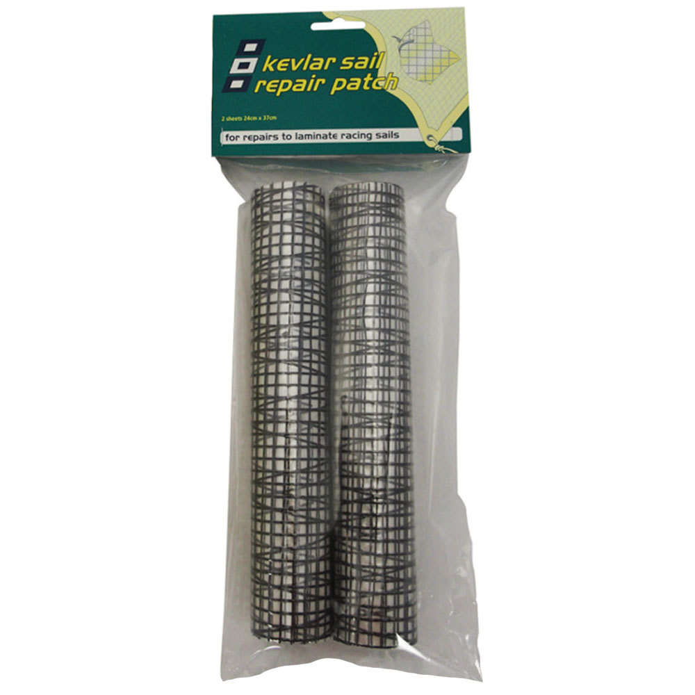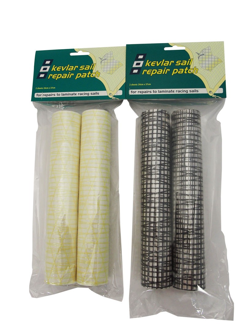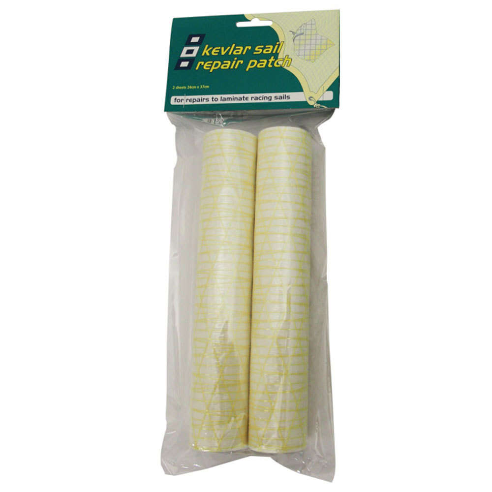 2 strong kevlar patches to apply either side when repairing a laminate racing sail. An essential on board emergency kit.