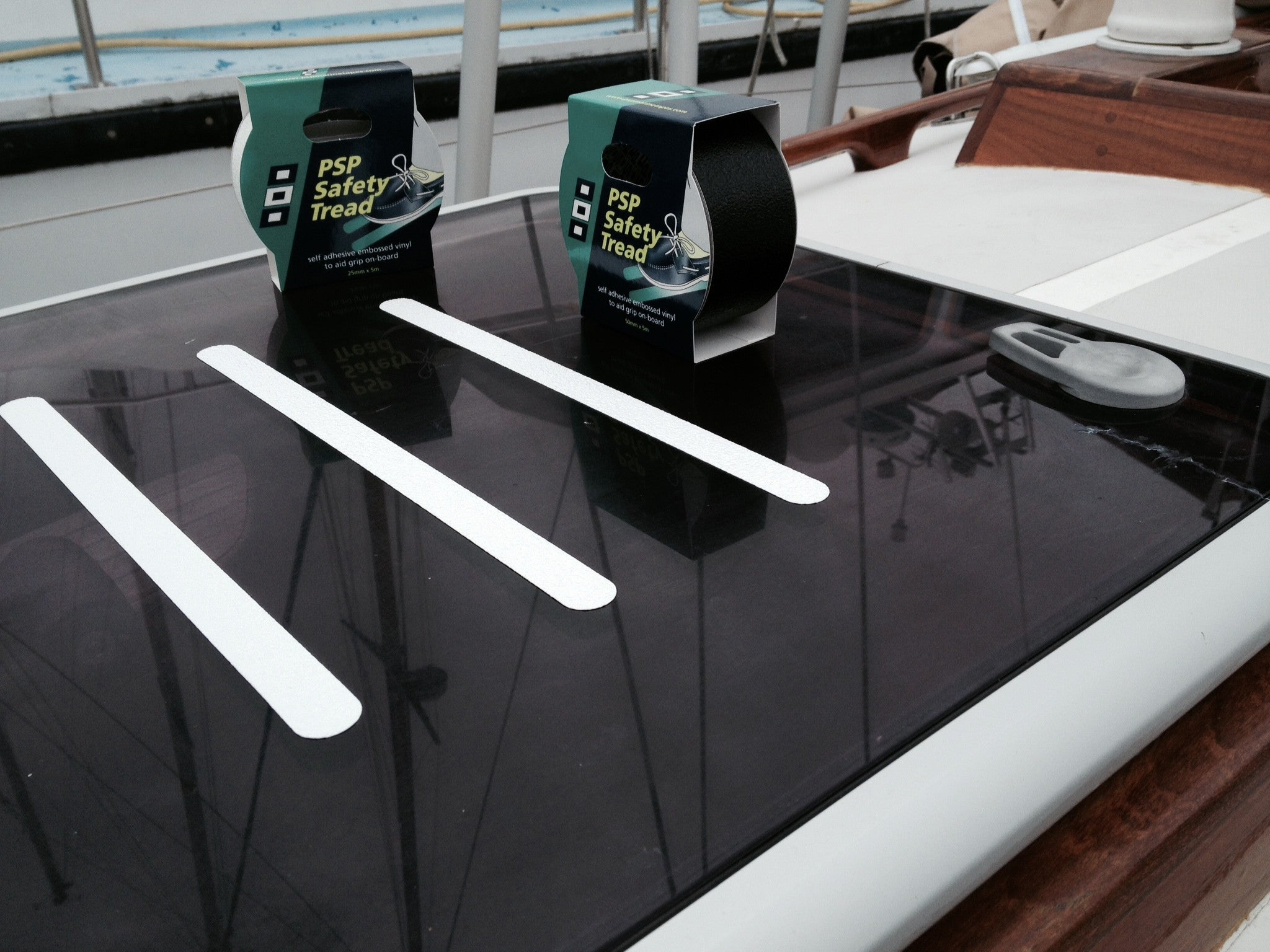 This non-slip surface for decks and companionways is easily applied and has a permanent pressure sensitive adhesive.