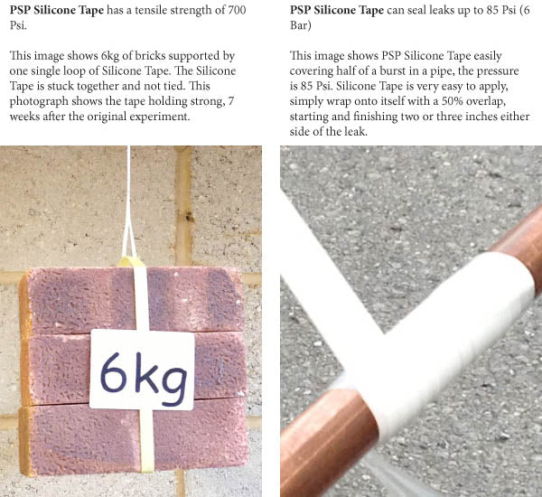The tensile strength has been tested in excess of 700psi and will effectively seal leaks up to 85Psi (6 bar). It also has good resistance to mild acids, fuels, oils, solvents, salt water, Ozone, UV light, and flames.